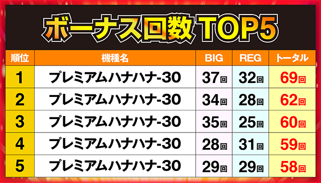 上位3台のボーナス回数は60回以上となっており、69回を記録した台が堂々の1位に輝いた。