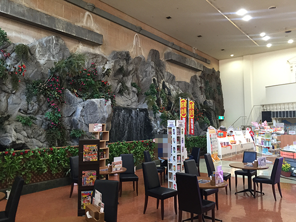 外観は爽やかな白で統一されていたが、ホール内には岩壁と滝といった一風変わった内装になっていた。