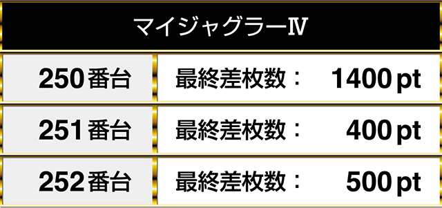 1400ptの台があった『マイジャグラーⅣ』も3台が連なってプラスptを記録!