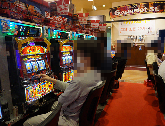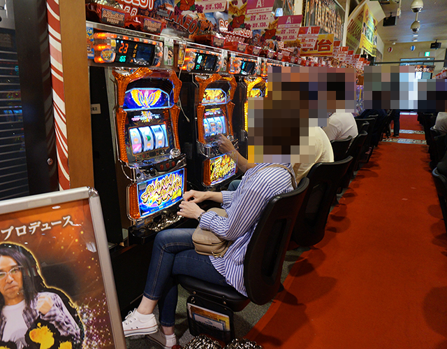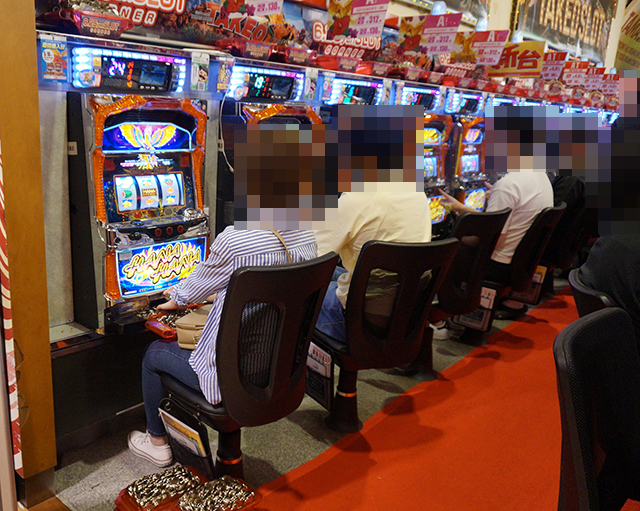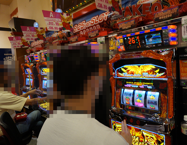 「ハナハナ鳳凰-30」は5台中3台が埋まっており、どの台でもプレイヤーは楽しそうな様子。