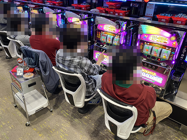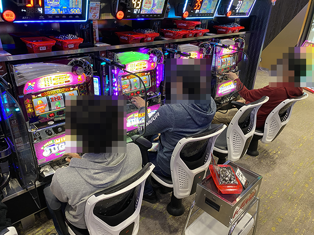 16時頃にパチスロコーナーをまわっていると、ジャグラーシリーズがひときわにぎわっていた。