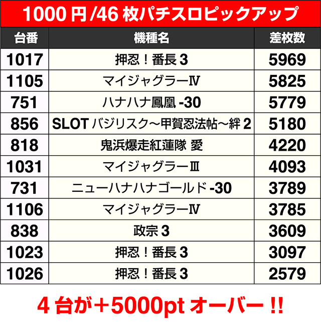 AT機では856番台の『SLOTバジリスク~甲賀忍法帖~絆2』、ART機では818番台の『鬼浜爆走紅蓮隊 愛』が+4000ptオーバー。