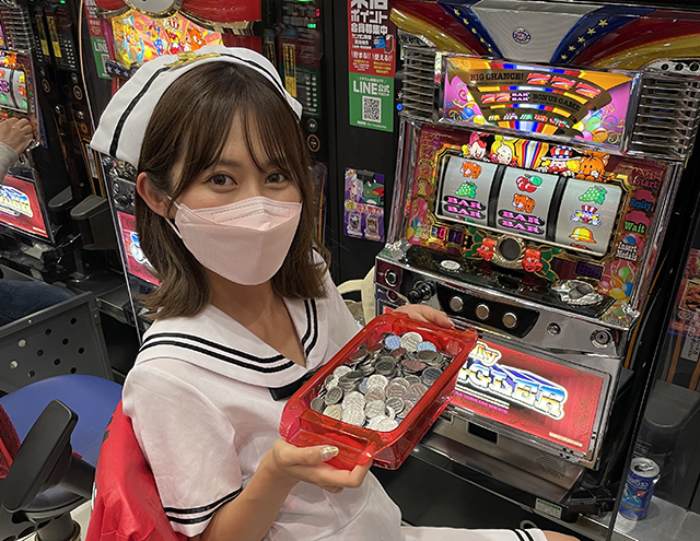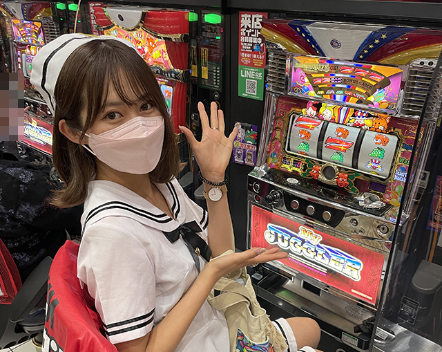 笑顔で遊技をおこなっているお客さまに囲まれながら、今回は「マイジャグラーⅢ」に座って実戦開始!