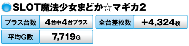 ともにすべての台がプラスで、全台差枚数もそれぞれ+4,324枚、+2,922枚を記録した。