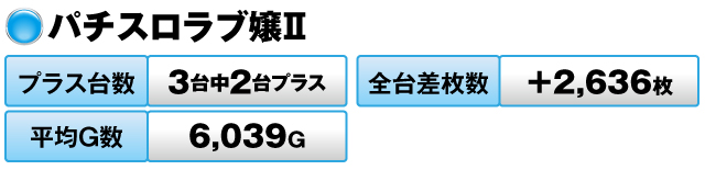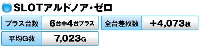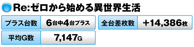 6台中4台がプラスで全台差枚数が+14,386枚、平均G数も7,147Gを記録した。