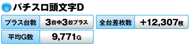 3台すべてがプラスで全台差枚数は+12,307枚、平均G数も9,771Gをマークした。