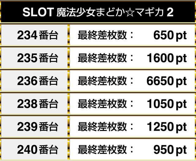 『SLOT魔法少女まどか☆マギカ2』の234番台から236番台、238番台から240番台の2箇所にプラスptが並ぶ!!