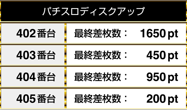 『パチスロディスクアップ』は4台が連なってプラスptを記録し、1台が1650pt!