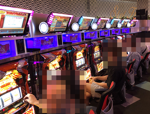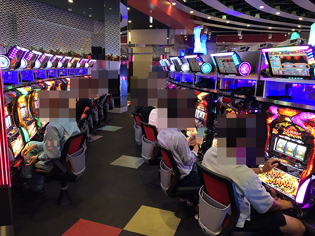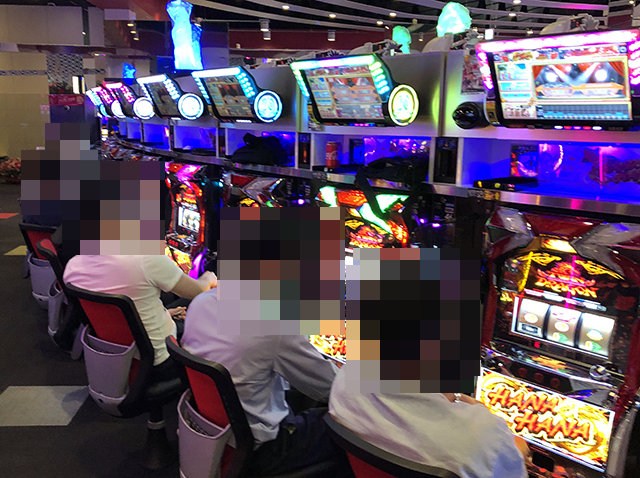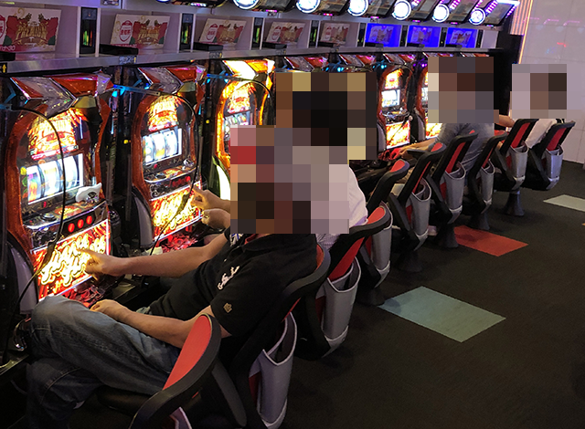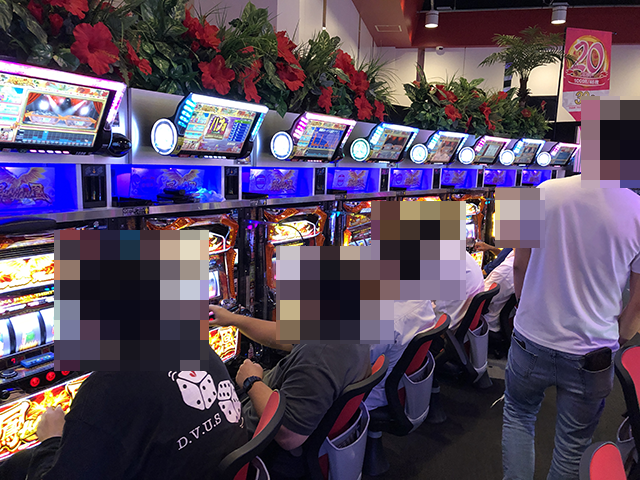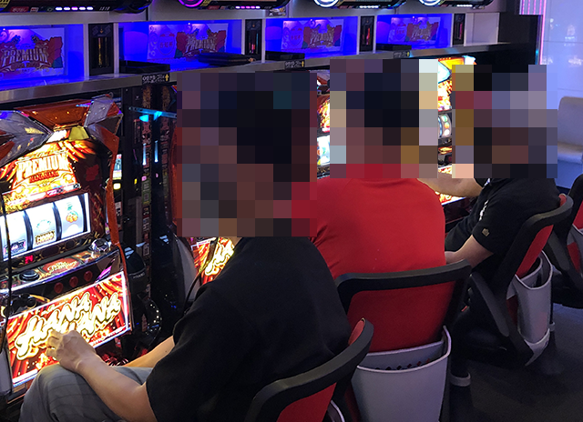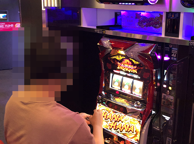 「プレミアムハナハナ-30」で遊技をおこなうプレイヤーをみてみると、表情が明るく、機種の魅力を味わえているといった様子。