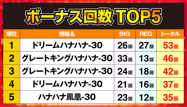 堂々の1位に輝いたのは、ボーナス回数53回を記録した「ドリームハナハナ-30」の1台であった。