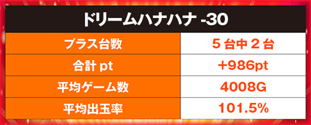 最終的に、この日をプラスで終えたのは5台中2台。平均ゲーム数は約4000Gと控えめであったものの、合計ptは+986ptを記録した。