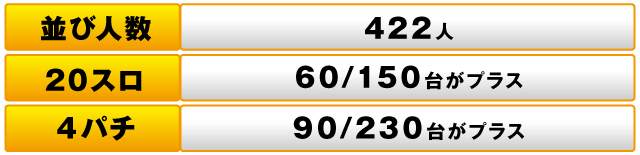 パチスロ全体では、150台中80台がプラスで、トータルの差枚数は+19,350枚という結果だった。