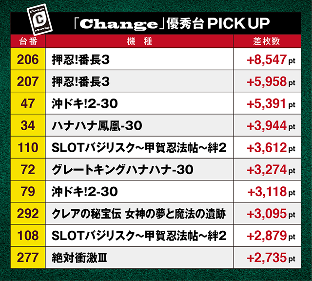 ほかにも、「クレアの秘宝伝 女神の夢と魔法の遺跡」や「絶対衝激Ⅲ」など、さまざまな機種で前日からの“Change”を確認した。