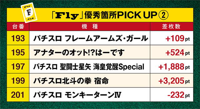 「パチスロ フレームアームズ・ガール」の193番台から「パチスロ北斗の拳 宿命」の199番台までも1台飛ばしでプラスptとなった。