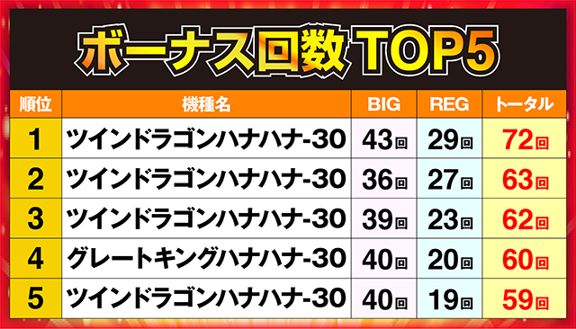 独占を阻止するかのように、「グレートキングハナハナ-30」もランクインしており、ボーナス回数60回で4位に食い込んだ。