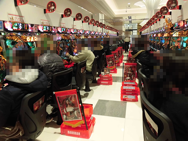 さまざまな機種が並ぶ1円パチンコのコーナーの活気も大きい。