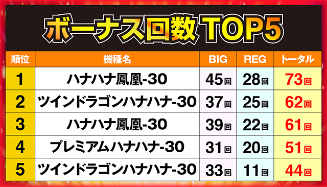ボーナス回数は70回を超え、2位と10回以上の差をつけて堂々の1位に輝いた。