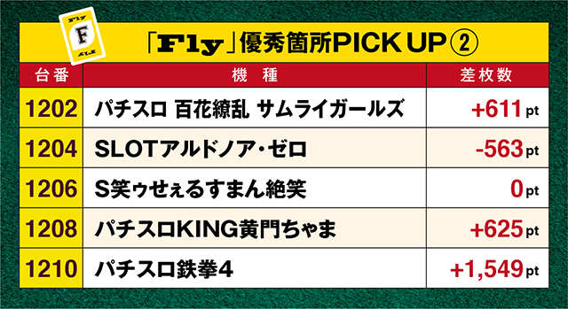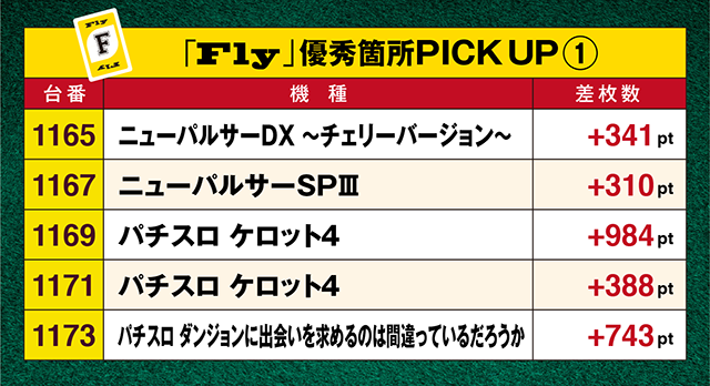 +900pt以上を記録した「パチスロ ケロット4」の1169番台を含め、5つの台に渡ってプラスptが“Fly”した。
