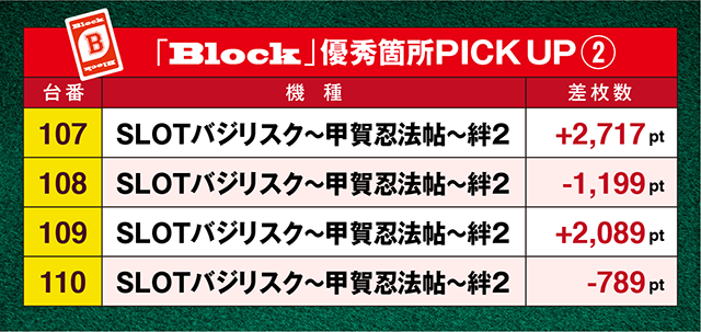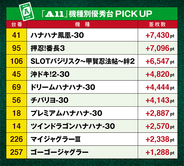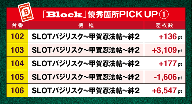 「押忍!番長3」の95番台は+7,096pt、「SLOTバジリスク~甲賀忍法帖~絆2」の106番台は+6,547ptを記録。