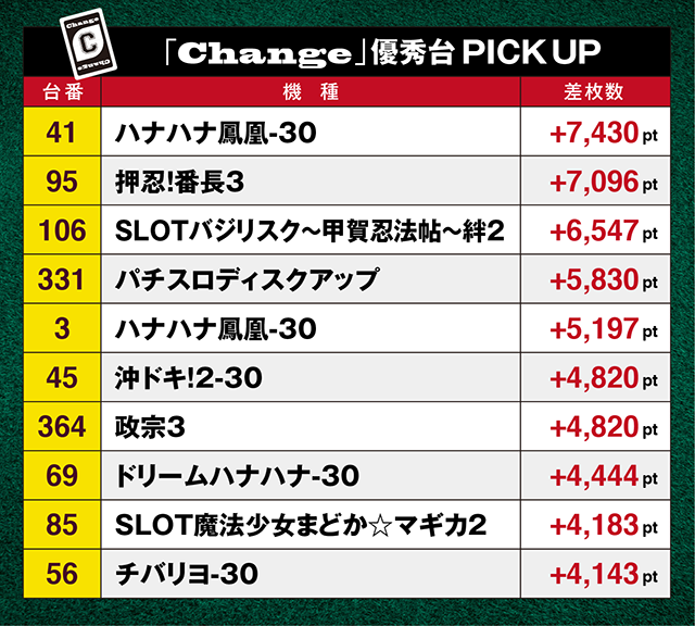 2台が+5,000pt超となった「ハナハナ鳳凰-30」をはじめ、沖スロの5台以上で華麗なる“Change”を確認!