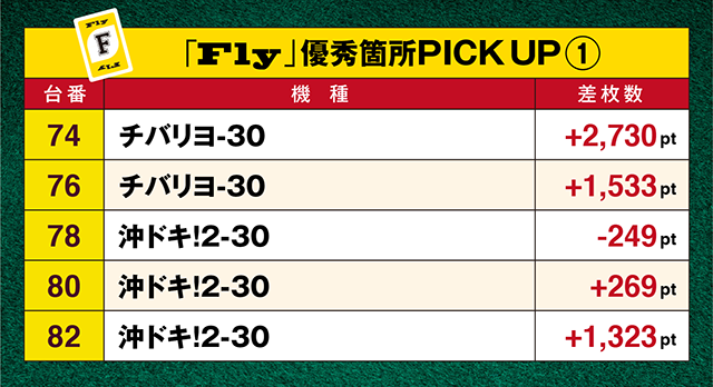 「沖ドキ!2-30」の80番台と82番台も飛び飛びでプラスptと、“Fly”の名にふさわしい結果となった。