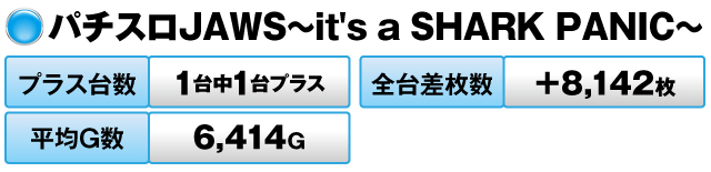 どちらも小台数ではあるが、8,000枚と5,000枚のプラス差枚数の結果に。特に、1台のみの『JAWS』に着席した方はお見事の一言。