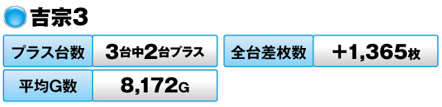 平均ゲーム数は驚異的な9,000G近く、1台のみマイナスとなったがその他3台は圧倒的なプラスとなり、全台差枚数+15,392枚の記録を樹立!