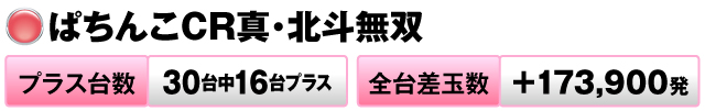 30台中16台がプラスで全台差玉数は+173,900発にも及んだ。