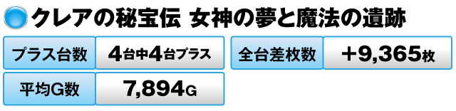 4台すべてがプラスで全台差枚数は+9,365枚、平均G数は9,894Gを記録した。