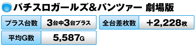 他には、『パチスロガールズ&パンツァー 劇場版』が好調で、3台すべてがプラスで全台差枚数は+2,228枚をマークした。