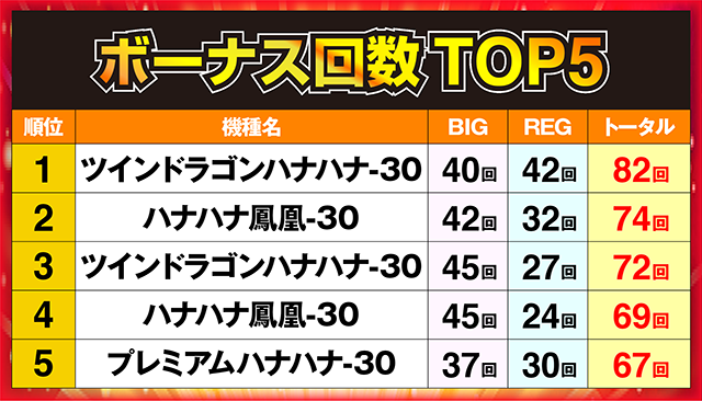 首位を獲得したのは、82回のボーナスに当選した「ツインドラゴンハナハナ-30」であった。
