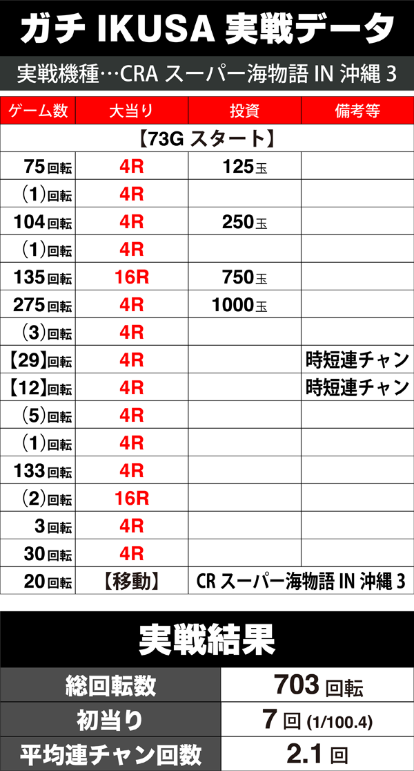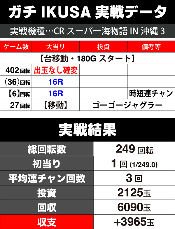 1台目の「CRAスーパー海物語IN沖縄3」と移動後の「CRスーパー海物語IN沖縄3」はどちらも250玉あたりの回転率が抜群に良く、理想的な流れでプラスの差玉を交換した。