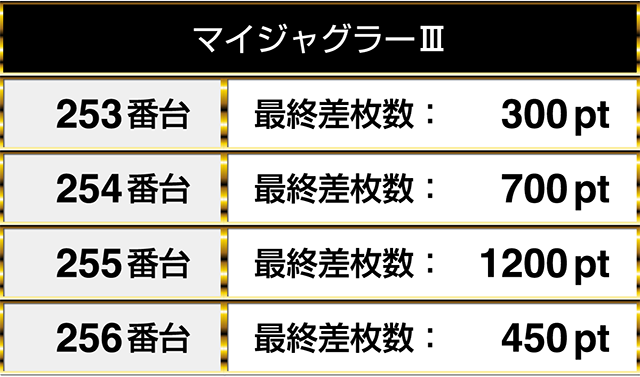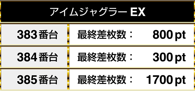 『アイムジャグラーEX』は3台が連なってプラスptとなり、そのうちの1台は1700ptであった。
