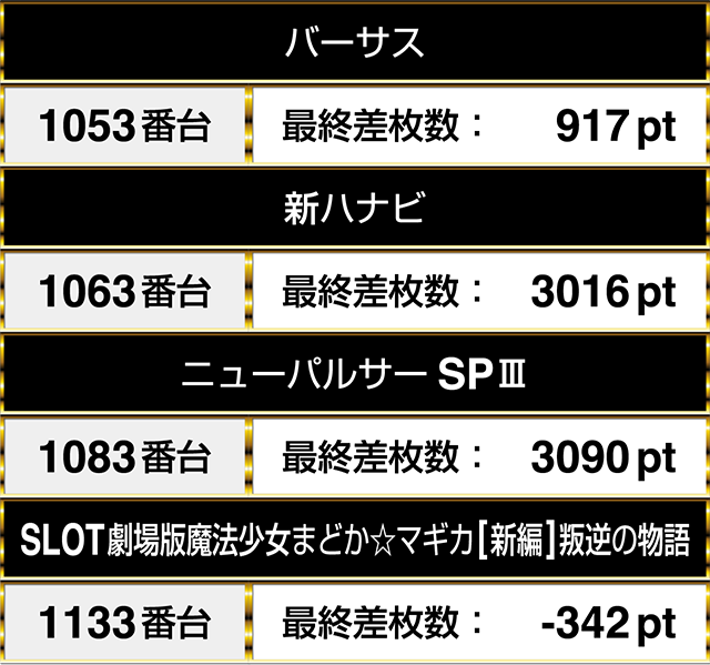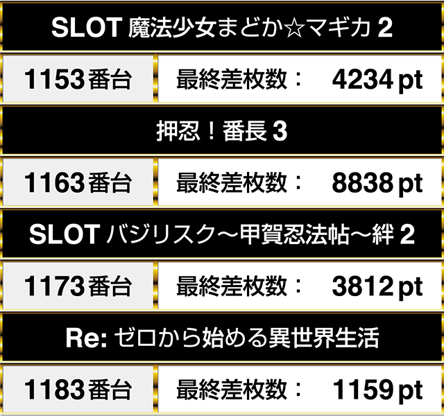 『SLOT魔法少女まどか☆マギカ2』の1153番台と『SLOTバジリスク~甲賀忍法帖~絆2』の1173番台は、どちらも3000pt以上であった。