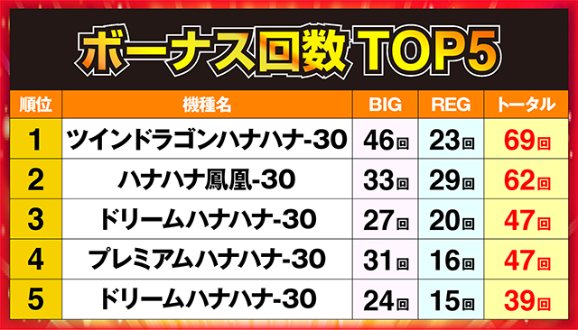 堂々の1位に輝いたのは「ツインドラゴンハナハナ-30」の1台で、ボーナス回数69回という好成績を残した。