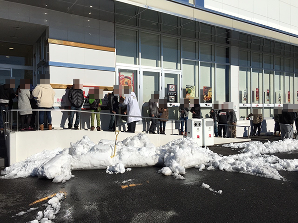 駐車場にまだ雪が残るなか、開店前から40名近いプレイヤーが集合。多くのプレイヤーが遊技を楽しみにしていることが伝わってきた。