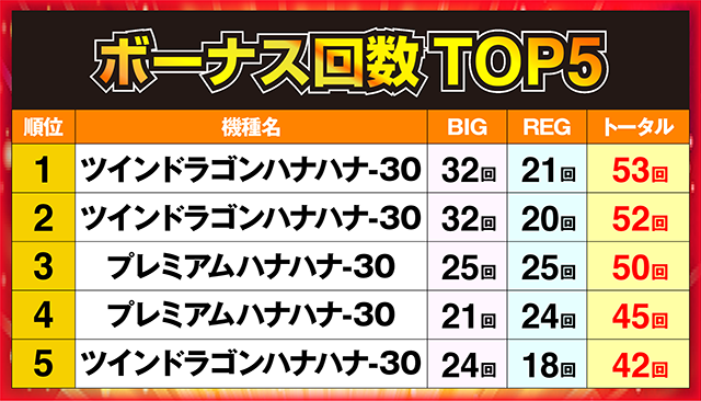 「ツインドラゴンハナハナ-30」の3台がTOP5入りをはたし、ボーナス回数53回を記録した1台がトップ!