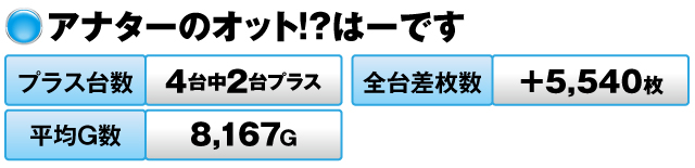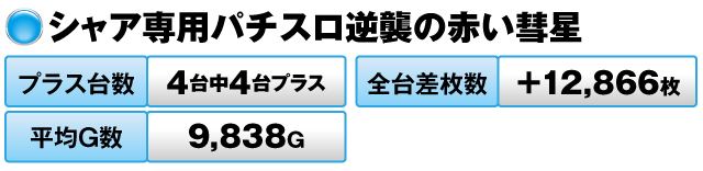 4台すべてがプラスで全台差枚数が+12,866枚、平均G数は9,838Gを記録した。