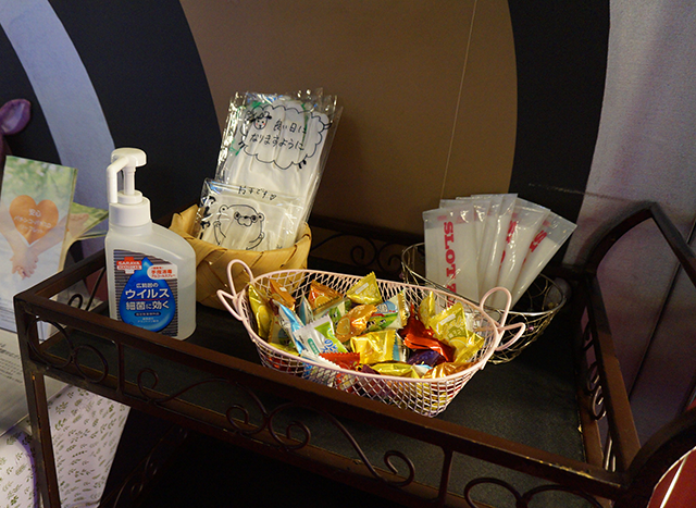 店内をまわっていると、自由に使えるおしぼりやアルコール消毒スプレーを発見!