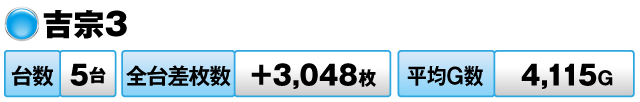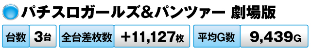 3台いずれも抜群の挙動を見せ、全台差枚数は+11,127枚、平均G数も9,439Gに達した。