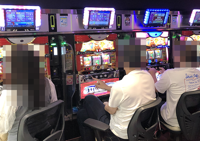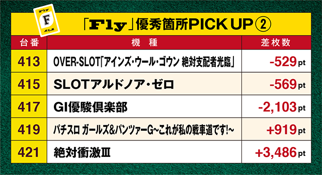 並びで設置された「パチスロ ガールズ&パンツァーG~これが私の戦車道です!~」と「絶対衝激Ⅲ」も1台置きにプラスptを記録し、421番台は+3,486ptとボリュームのある結果を残した。