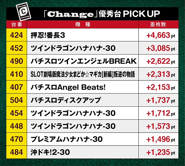 また、「ツインドラゴンハナハナ-30」や「プレミアムハナハナ-30」といったボーナスタイプでも前日からの“Change”を確認した。