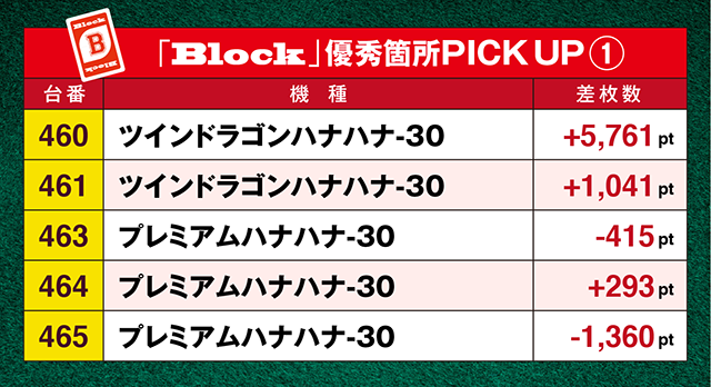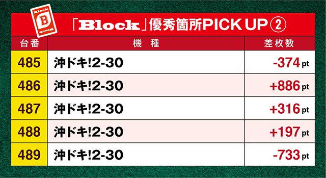 「沖ドキ!2-30」は486番台から488番台までの3台にプラスptが固るなど、沖スロを中心に“Block”と呼ぶにふさわしい結果が残った。