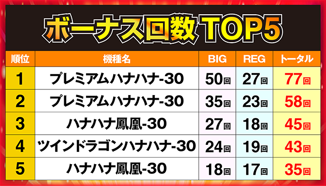 「プレミアムハナハナ-30」が1位と2位に並び、77回のボーナスに当選した台が堂々のトップ!