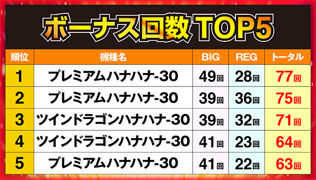 上位3台のボーナス回数が70回を超えるハイレベルなランキング!