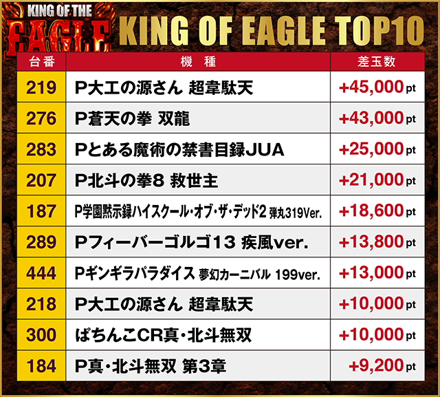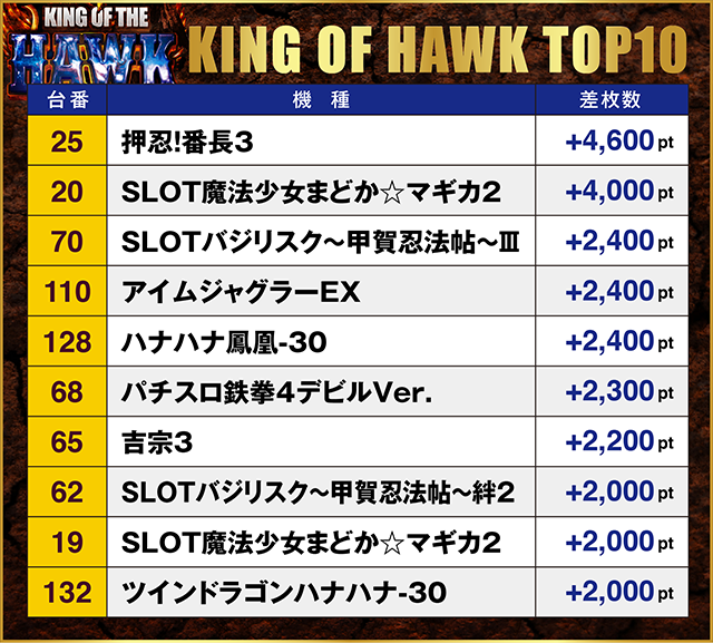 パチスロもランクインした10台すべてが+2,000pt以上と好成績を残したが、残念ながら一歩及ばす。
