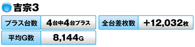 4台すべてがプラスで全台差枚数が+12,032枚、平均G数も8,144Gを記録した。