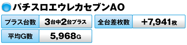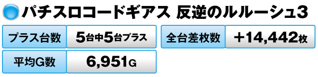 3台中2台がプラス、平均ゲーム数は6,000G弱、全台差枚数は+8,000枚弱をマークした。