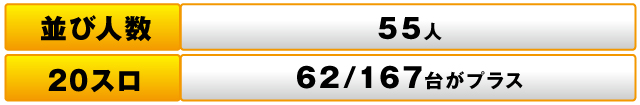 20スロ167台中62台がプラス、トータルの差枚数は+38,410枚を記録した。