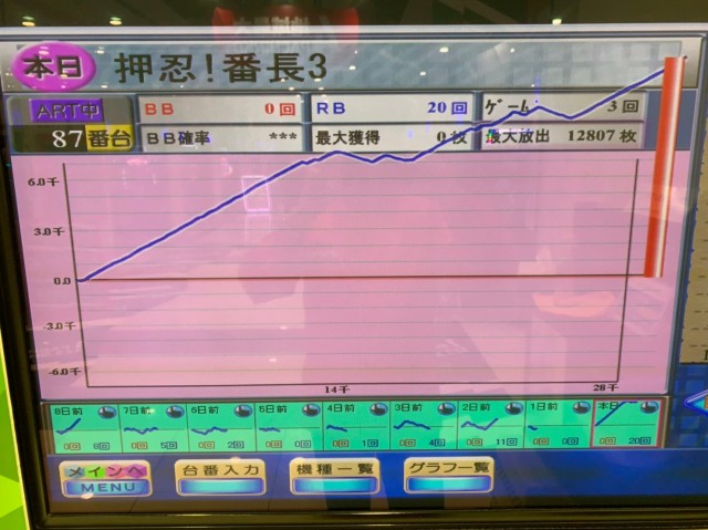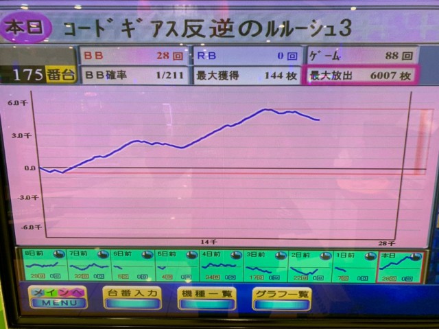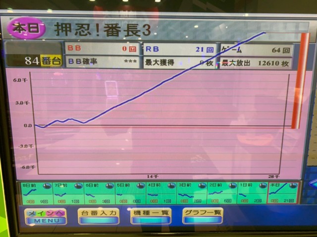 8台の75%がプラス、平均ゲーム数は4,000G弱とあまり多くはなかったが、全台差枚数はプラス8,000枚超とチャンスをモノにした形だ。